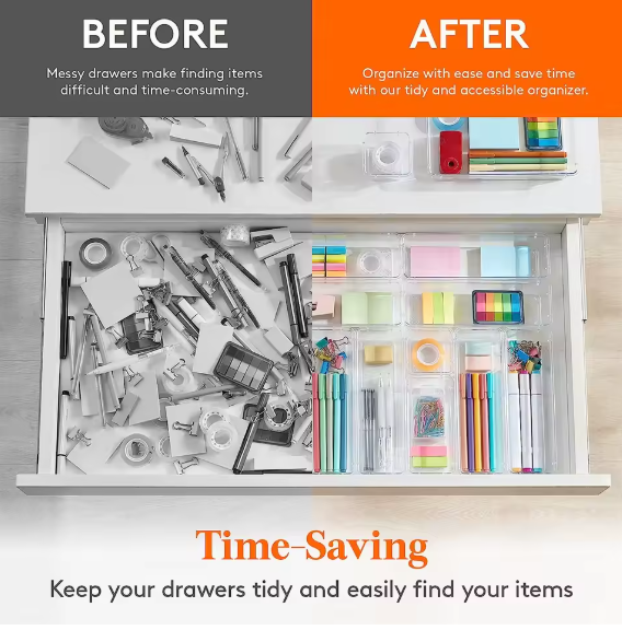 10-teiliges, vielseitiges Schubladen-Organizer-Set – transparente Kunststofftabletts und Trennwände in 4 Größen für perfekte Make-up- und Küchenaufbewahrung